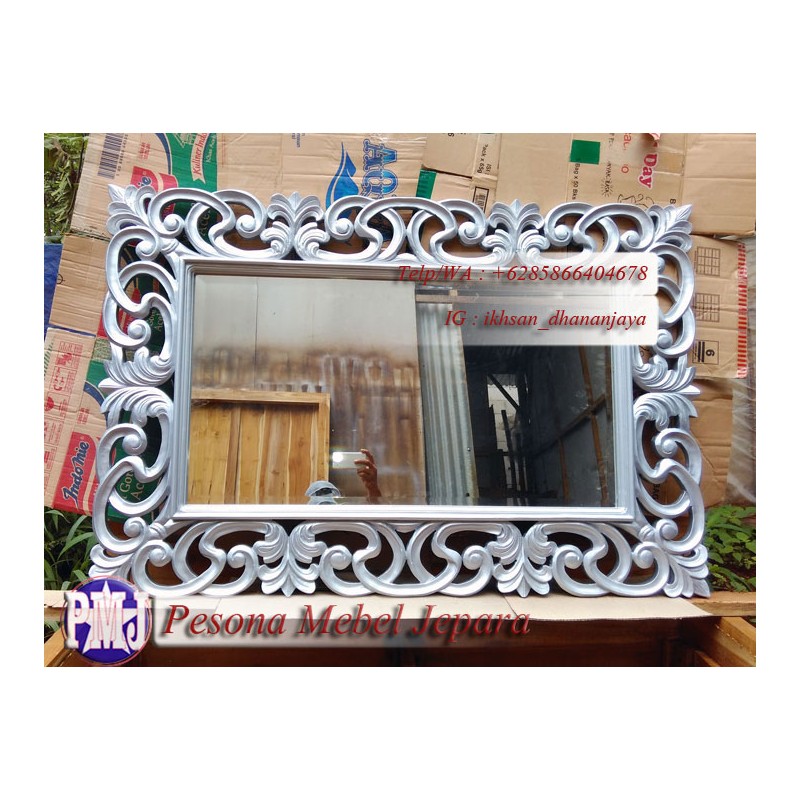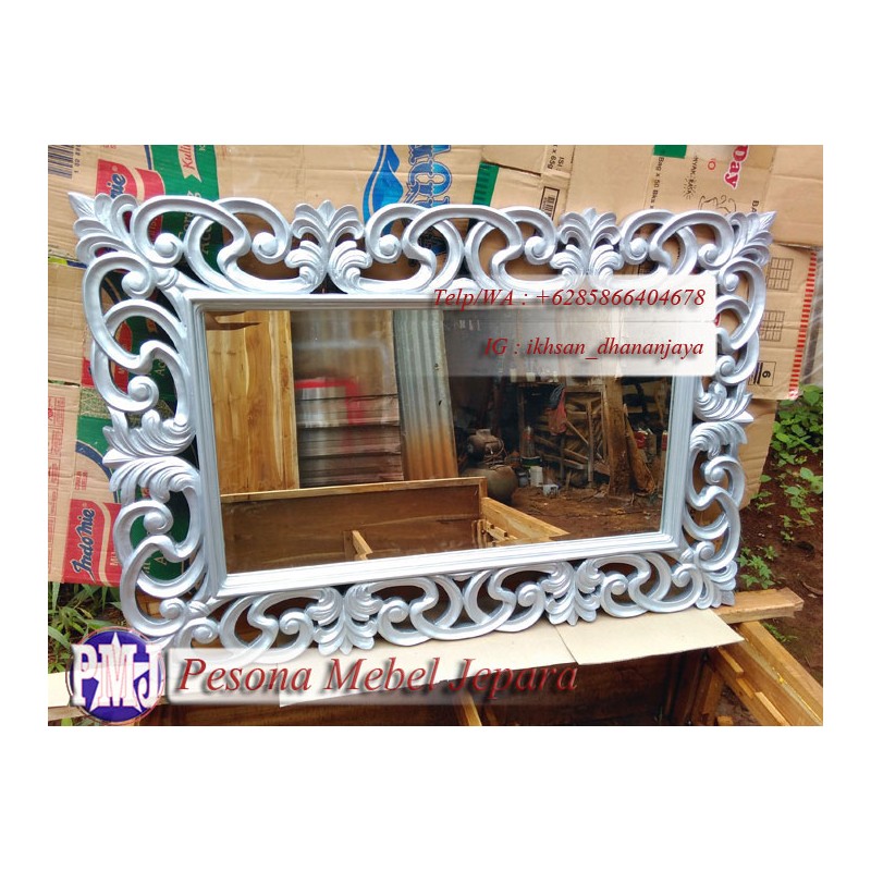 Frame atau Bingkai atau Pigura Cermin Ukir Lung Kelapa Warna Silver Kayu Jati