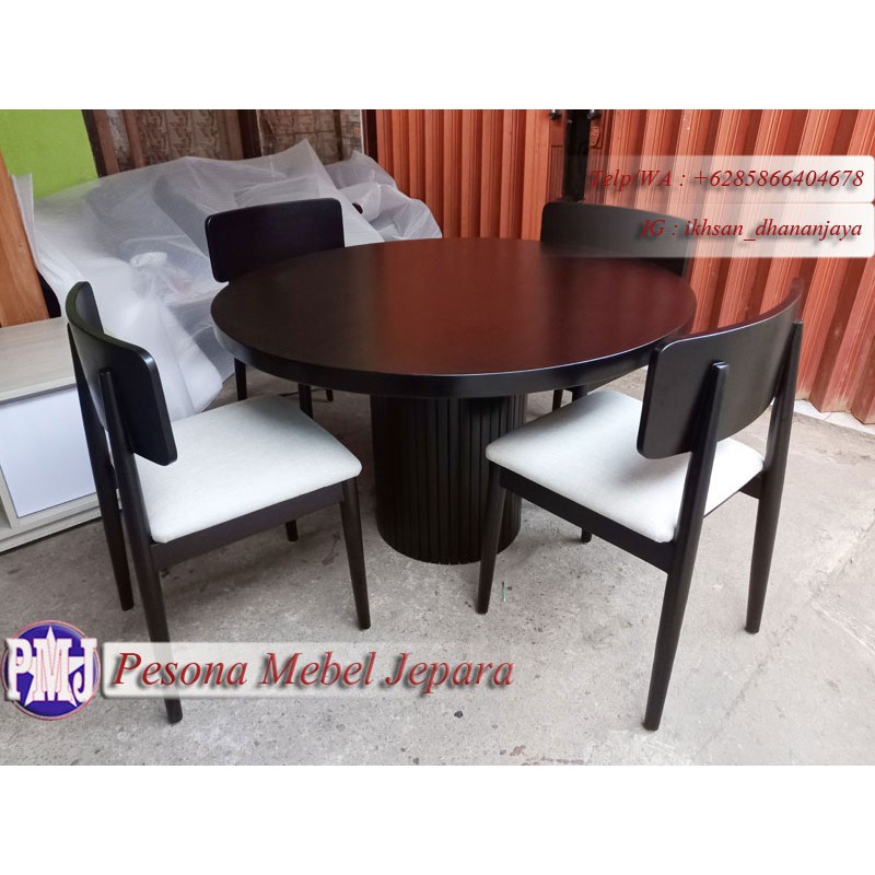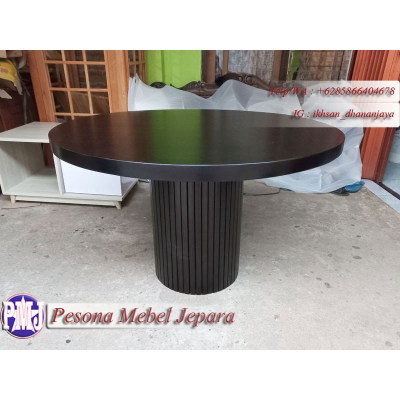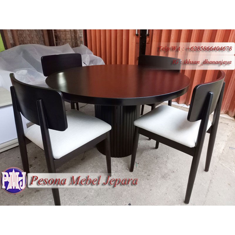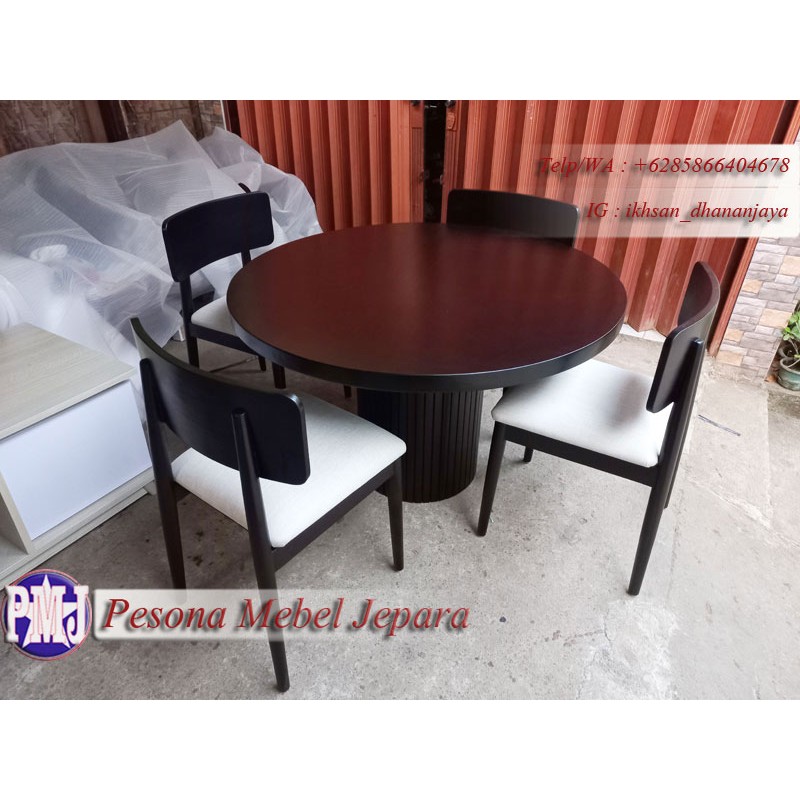 Meja makan bundar dengan model minimalis dengan bahan berkwalitas dan konstruksi yang kuat.