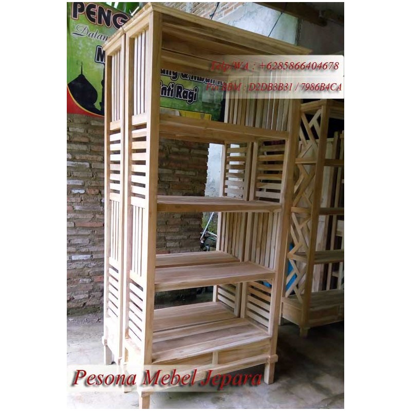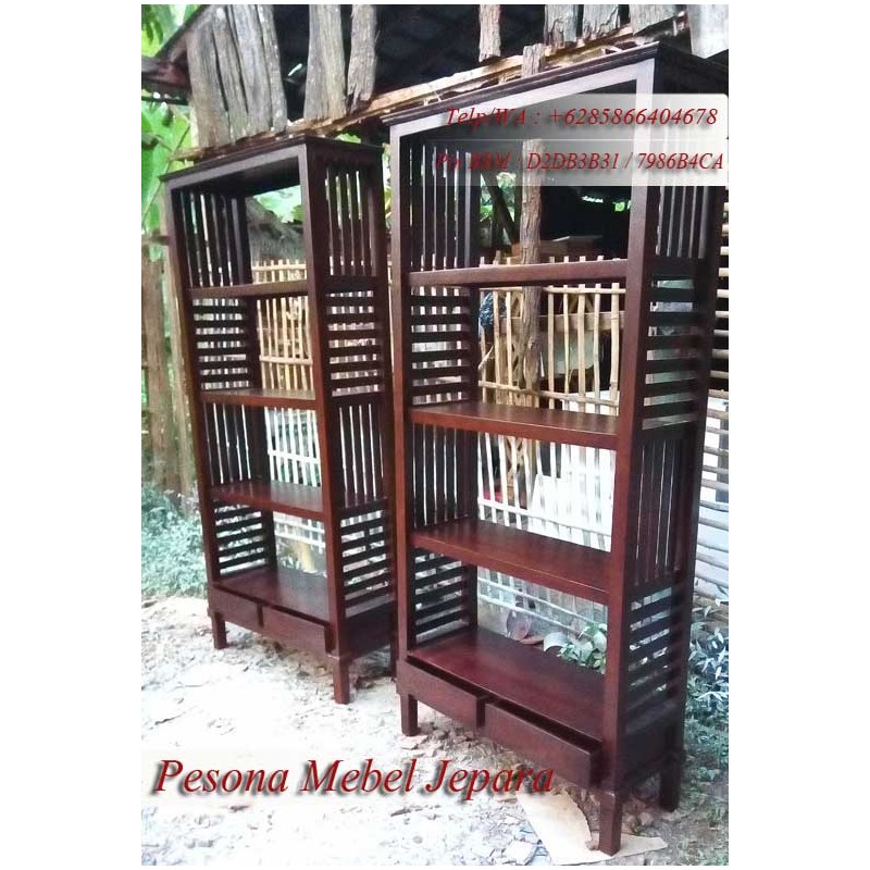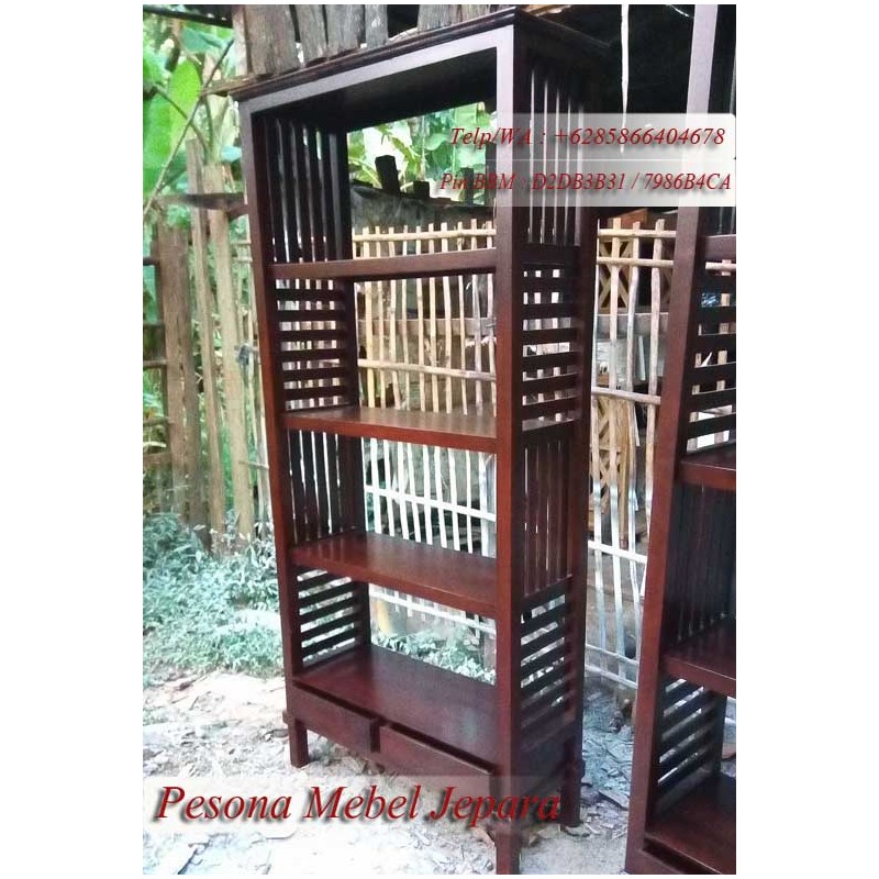 Rak buku yang terbuat dari kayu jati, produk asli Jepara. Dikerjakan oleh tangan-tangan yang trampil dibidangnya. konstruksi kuat. Finishing melamine halus. Terdapat 2 laci di bagian bawah. Model ruji-ruji.